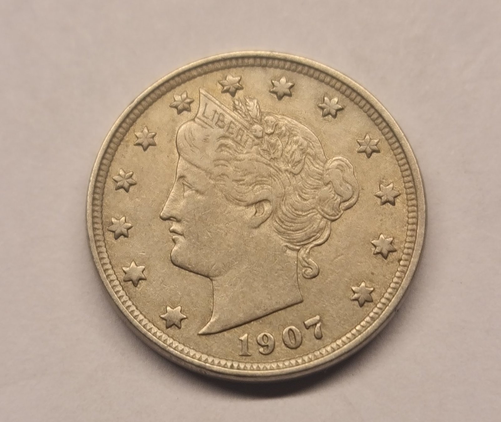 The obverse features Lady Liberty wearing a coronet inscribed LIBERTY, while the reverse displays the Roman numeral “V”, indicating the five-cent denomination, surrounded by a wreath. By 1907, the design was well established and widely circulated, making surviving examples popular with collectors today.